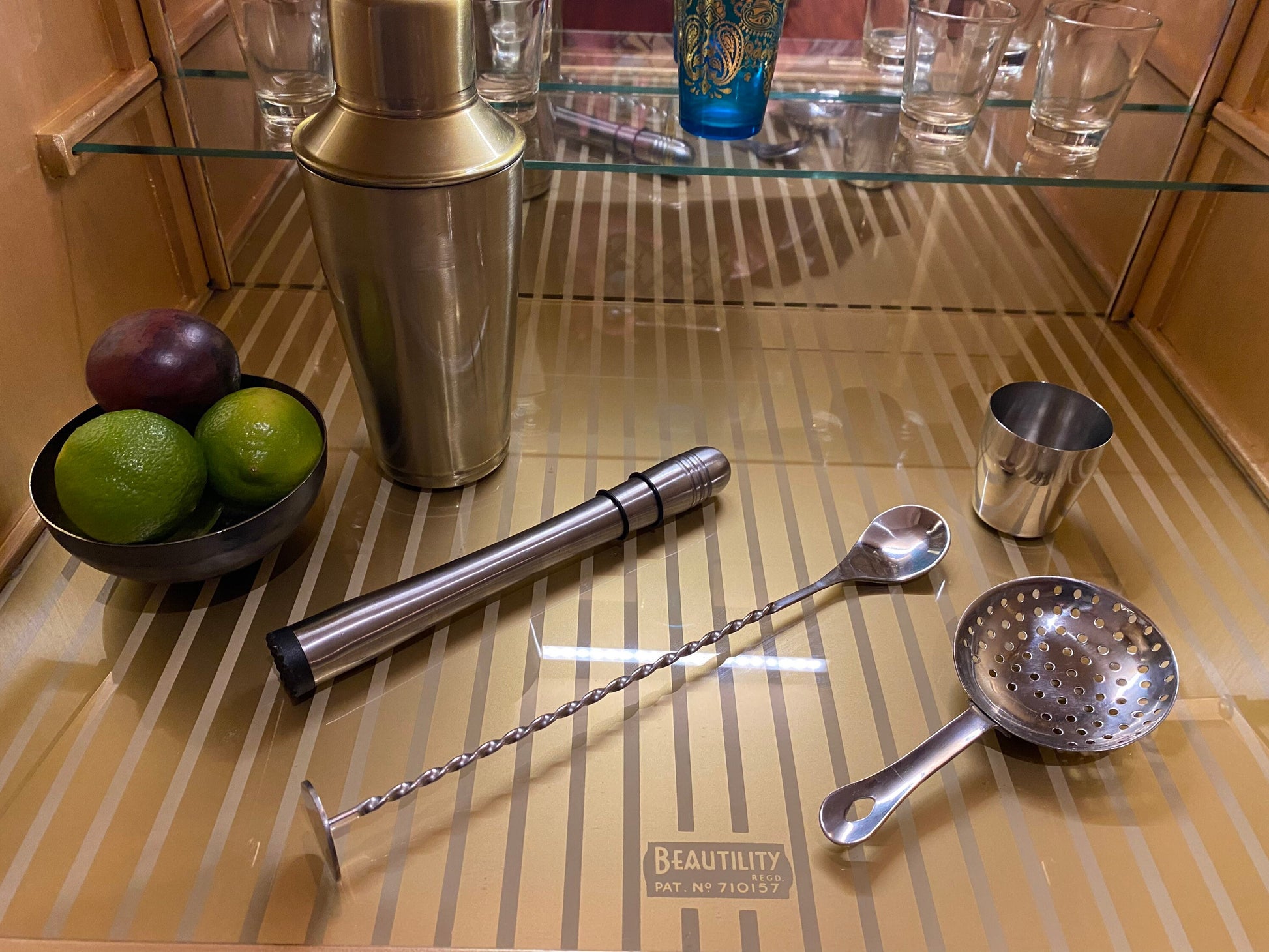 the stripped glass base has the Beautility logo etched in