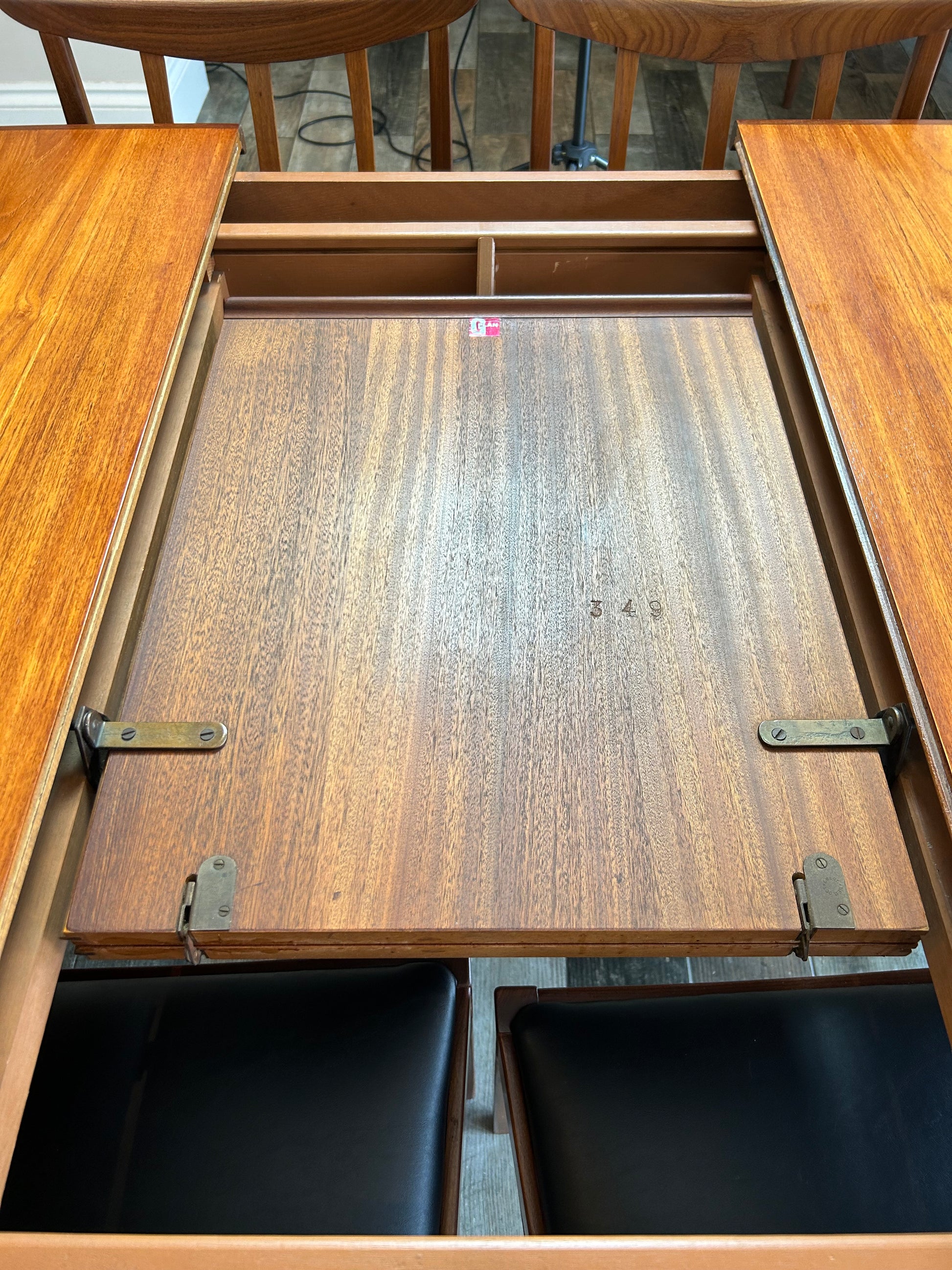 The extending dining table has been restored to its former glory with beautiful teak graining. This is a large table that sits 6 people comfortably , with a butterfly leaf mechanism , beautiful teak tapered legs this is a great MCM style icon
